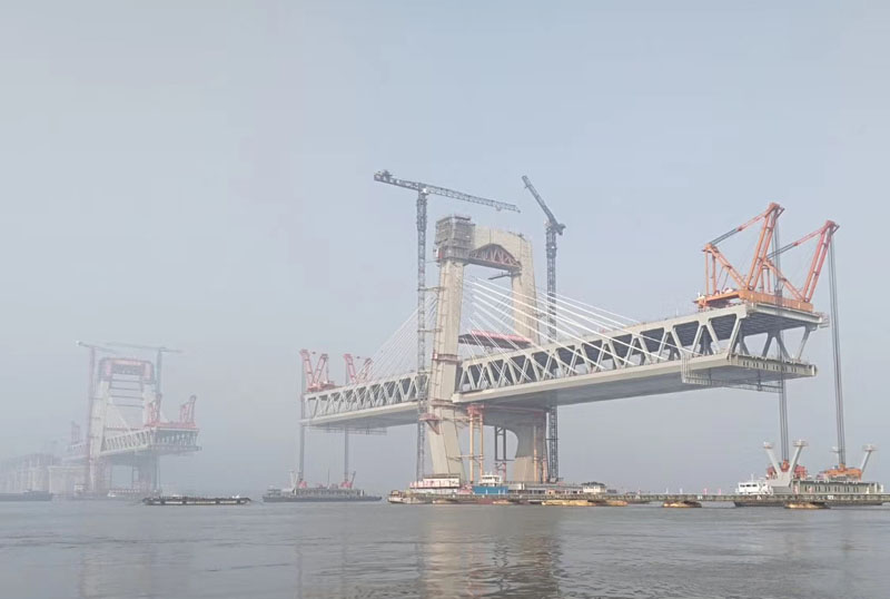 商合杭鐵路蕪湖長江公鐵大橋?yàn)橹骺?88米雙塔雙索面高低塔鋼箱鋼桁組合梁斜拉橋,北岸塔高155米,南岸塔高130.5米,上層為雙向八車道城市道路,下層為客運(yùn)專線和市域軌道線的四線鐵路,是集客運(yùn)專線、市域軌道交通、城市主干道路于一體的公鐵合建橋梁。