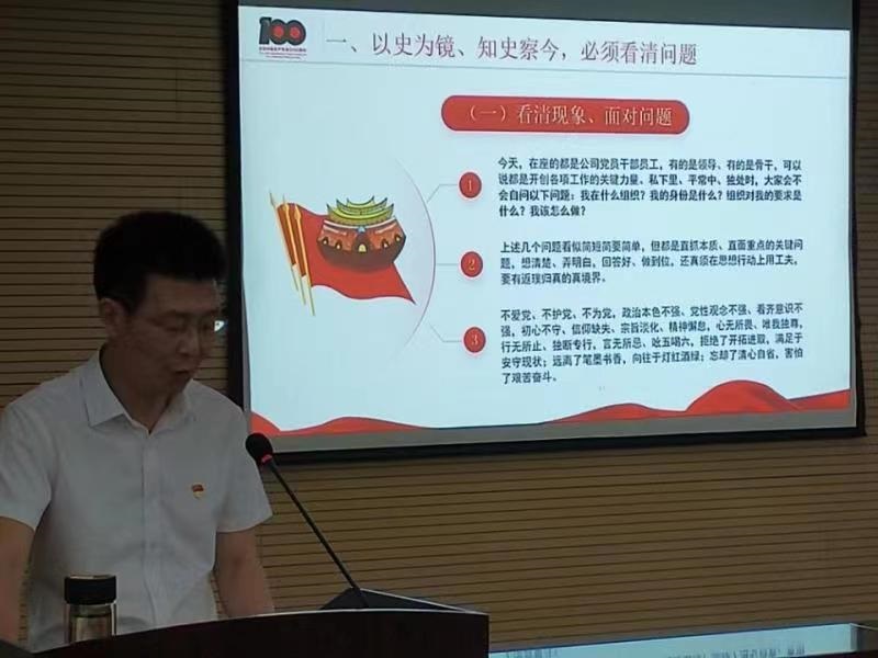 夏峰董事長(zhǎng)以“以百年黨史砥礪初心使命在新征程上行大道擔(dān)大任成大器”為題講授專題黨課。報(bào)告從看清問(wèn)題、守道明理、堅(jiān)定理想、明德修身、擔(dān)當(dāng)作為五個(gè)方面勉勵(lì)公司全體干部員工作為新時(shí)代的建設(shè)者,要從百年黨史中汲取奮進(jìn)力量,從過(guò)往的足跡中獲得啟示,初心不改、信仰不墜、使命不忘,共同以臨淵履冰的敬畏之心扛起新時(shí)代高質(zhì)量發(fā)展的重任。